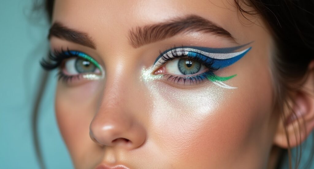 Forget plain black wings — 2025’s eyeliner is all about fun shapes, colored liners, and double flicks. From white and metallic lines to geometric designs, this trend turns your eyes into an artistic statement.